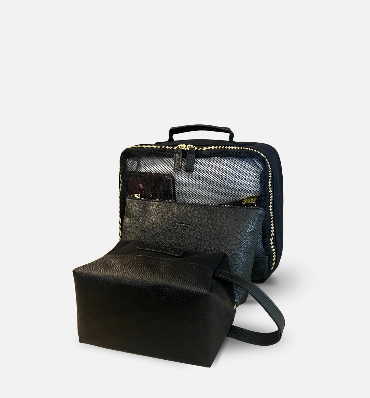 The three mini bags are designed to make your organization easier: one for your skincare products, another for your underwear or accessories, and a final one for your travel essentials. A harmonious set, both practical and refined.